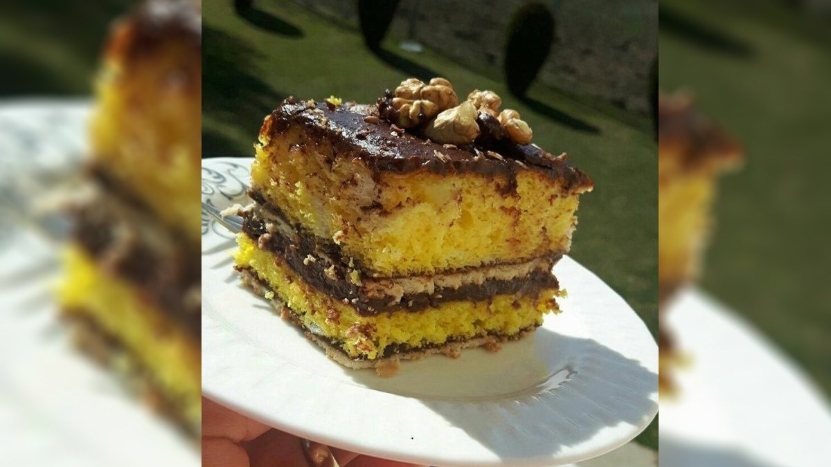 Pasi ëmbëlsirë të piqet e lëmë për pak të ftohet më pas e largojmë nga tepsja dhe e ndajmë në dy pjesë të barabarta. Në ndërkohë përgatisim fillin me përbërësit që i kemi cekur më lartë duke i shtuar një nga një në një enë kuzhine (tenxhere) dhe e ziejmë mirë deri sa të trashet për disa minuta.